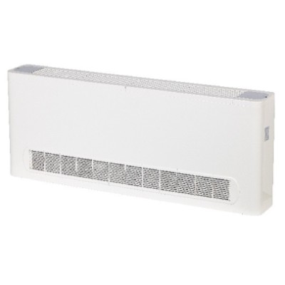 تصویر یک فن کویل زمینی سفید رنگ با طراحی افقی و مشبک در قسمت پایینی، از شرکت تهویه نوین